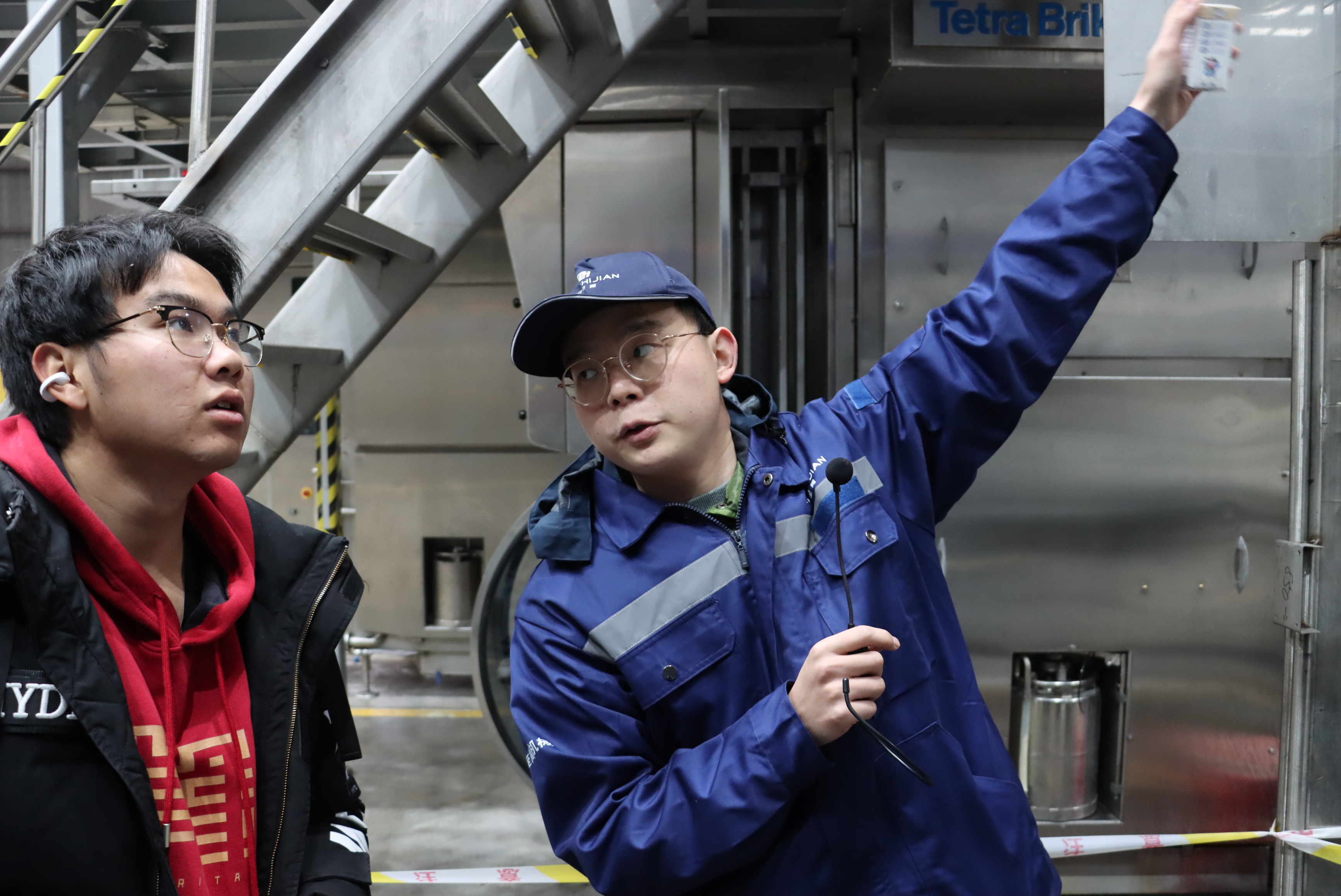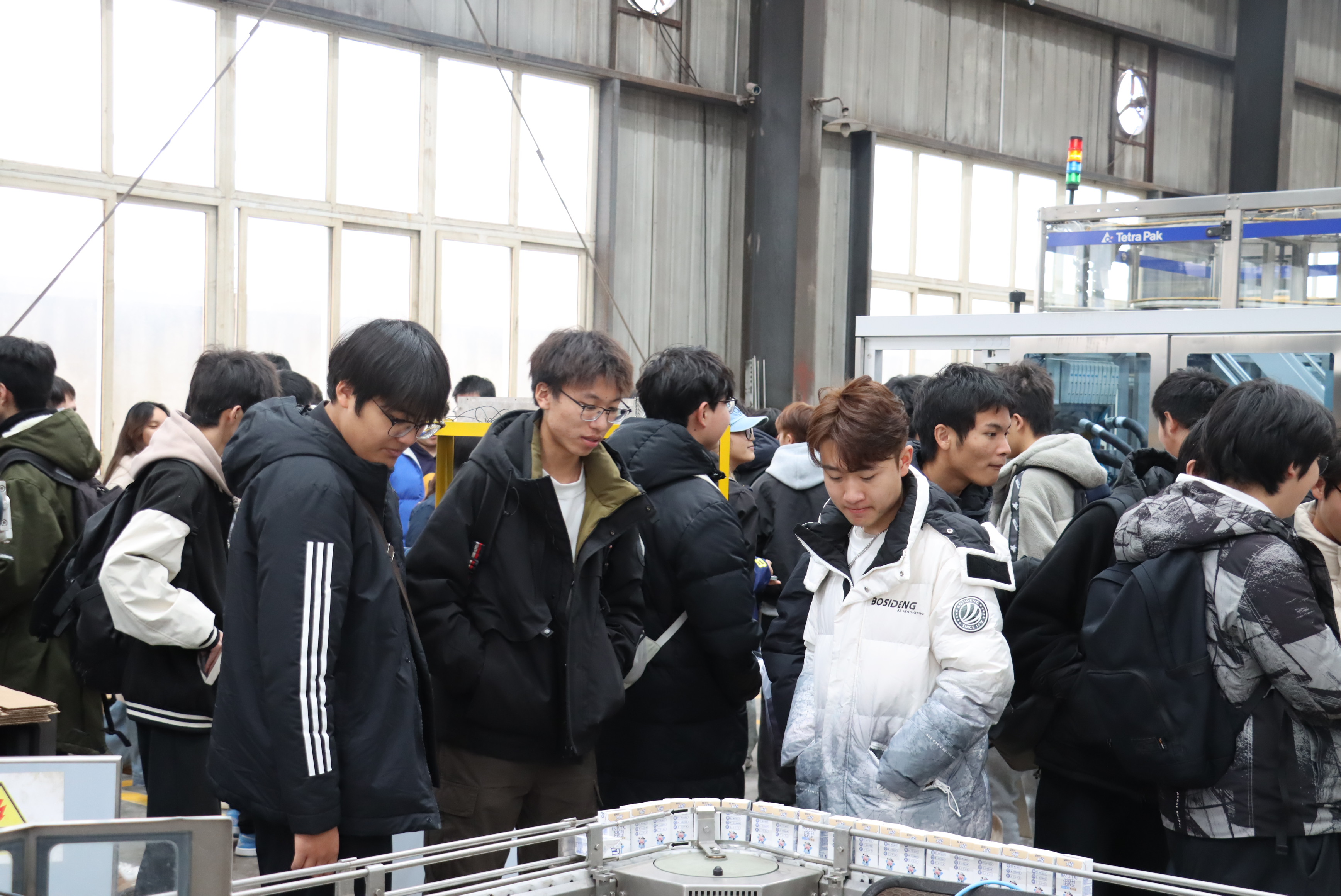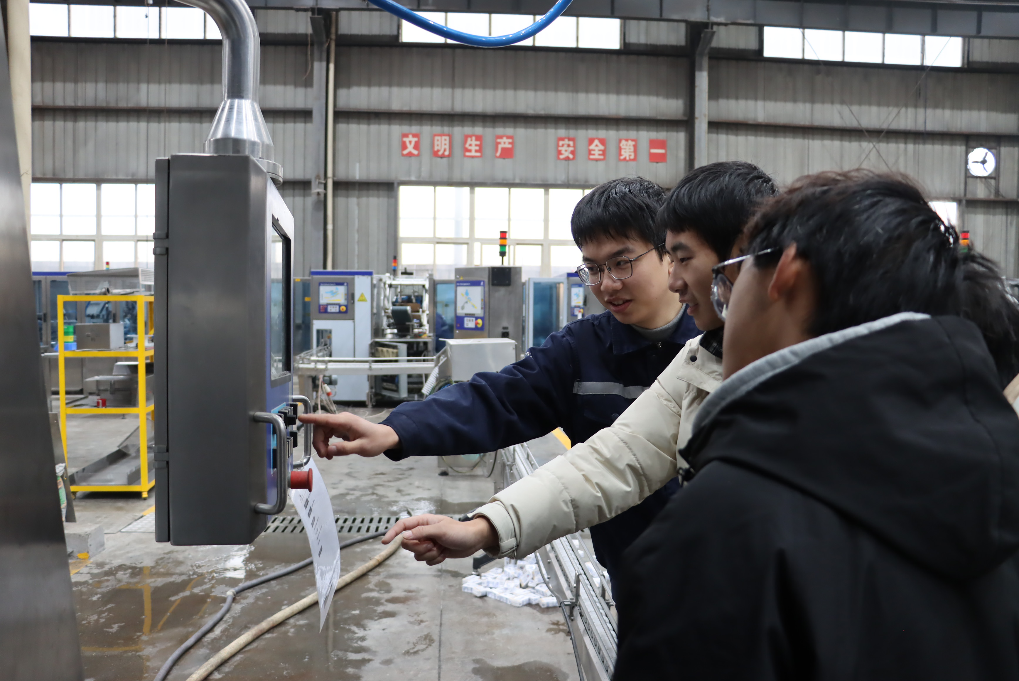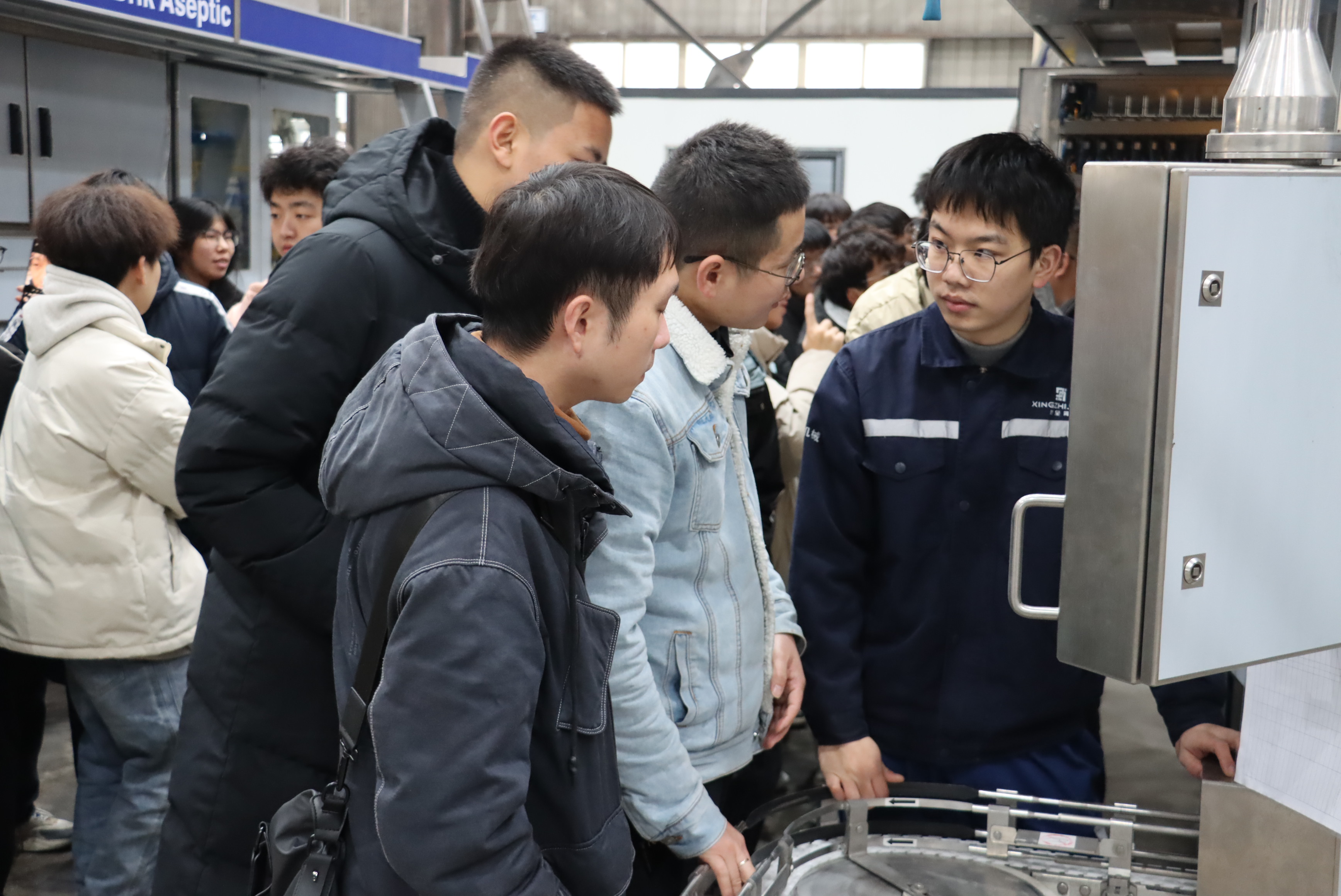 認知實習現(xiàn)場,學生展現(xiàn)出對灌裝機運行的濃厚興趣,踴躍向工程師請教。