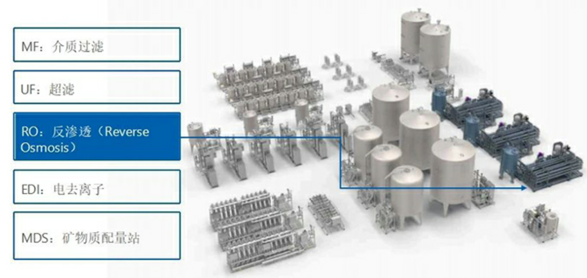 RO (反滲透): 利用高壓作用通過反滲透膜分離出水中的無機鹽,最終達到脫鹽的目的,同時去除有機污染物和細菌,截留水污染物。